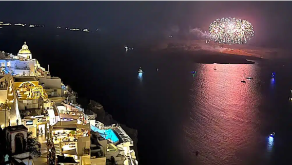 Az idei ünnepség középpontjában egy lenyűgöző drónfényshow állt. Élő narráció kísérte a drónokat, ahogy az éjszakai égbolton mozogtak, és Santorini történetét mesélték az érdeklődőknek.